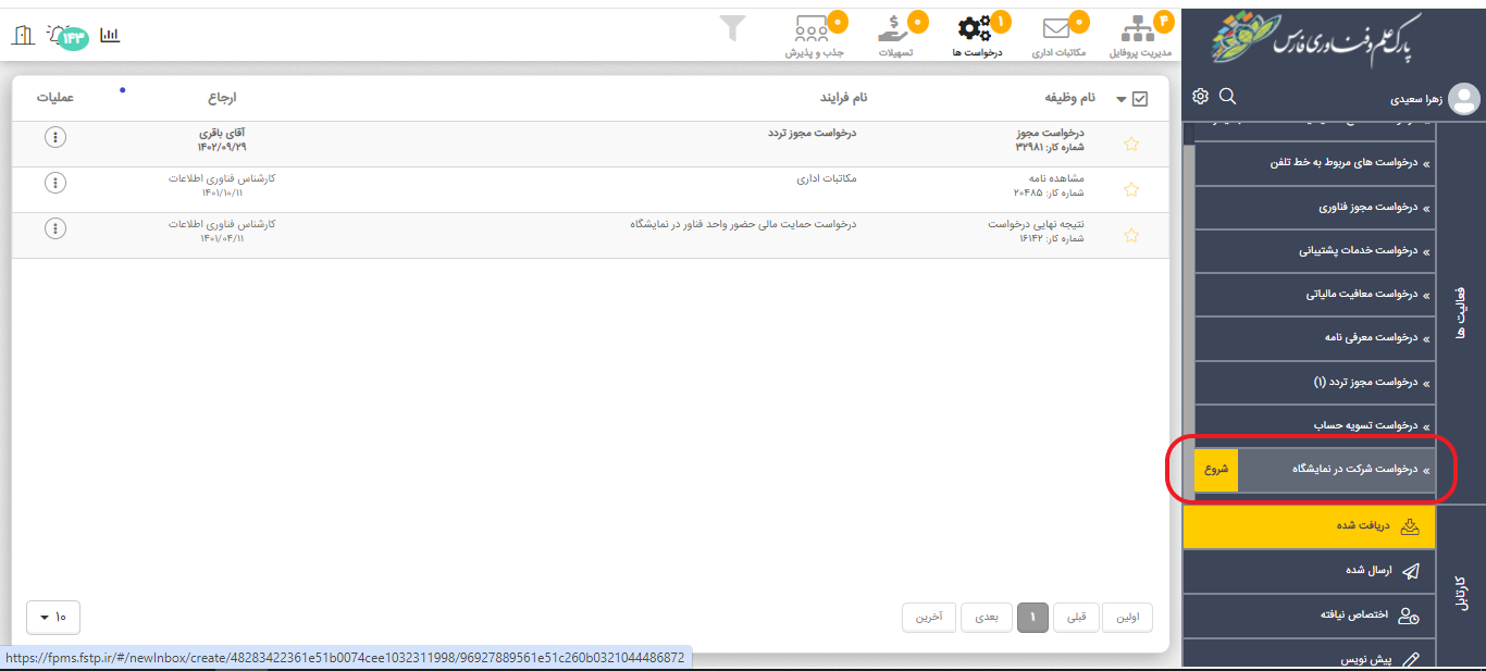 سپس گزینه شروع مربوط به فرایند "درخواست شرکت در نمایشگاه" را انتخاب نمایید.