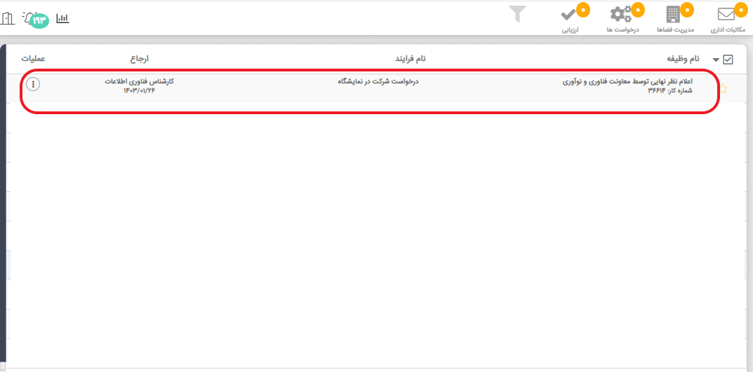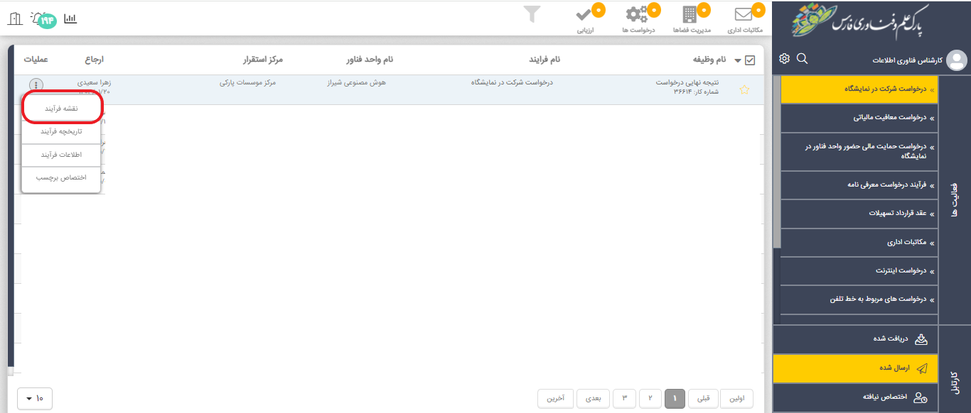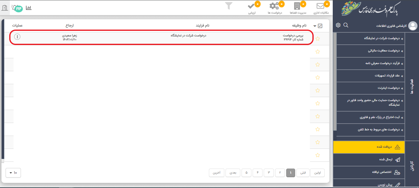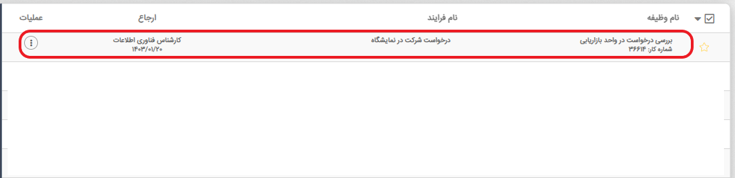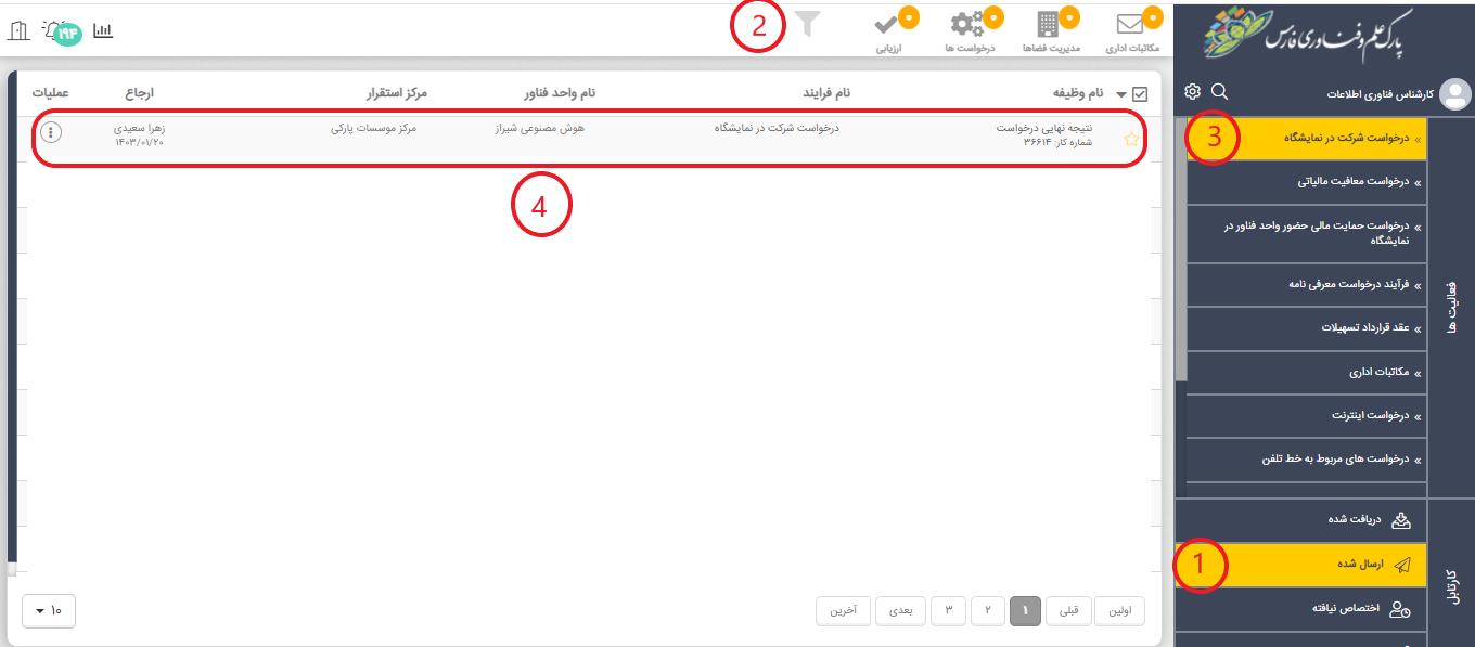 پس از مشاهده وجود درخواست با عنوان فرایند "درخواست شرکت در نمایشگاه" در کارتابل، آن را انتخاب و باز کنید.