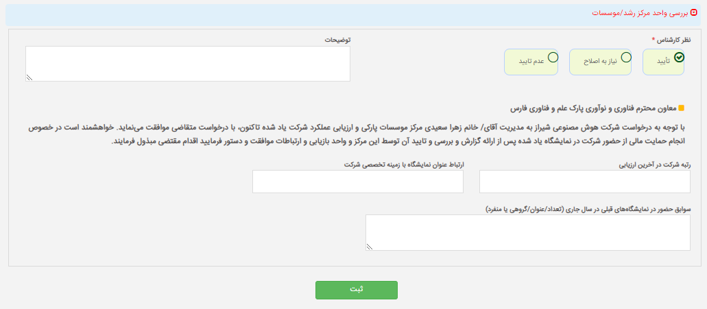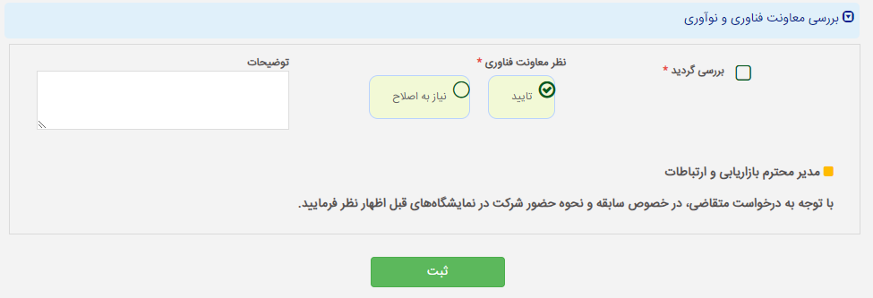 در صورتی که فرم ارسالی توسط شرکت نیاز به اصلاح داشته باشد با وارد نمودن توضیحات می توانید با کلید "نیاز به اصلاح" فرم را به شرکت ارجاع دهید. در این حالت شرکت توسط پیام کوتاه از اقدام برای اصلاح فرم مطلع خواهد شد. در غیر این صورت فرم مشخص شده را بر اساس اطلاعات مربوطه تکمیل نمایید و دکمه تایید و سپس ثبت را برای اجاع فرم به واحد معاونت فناوری و نوآوری انتخاب نمایید.