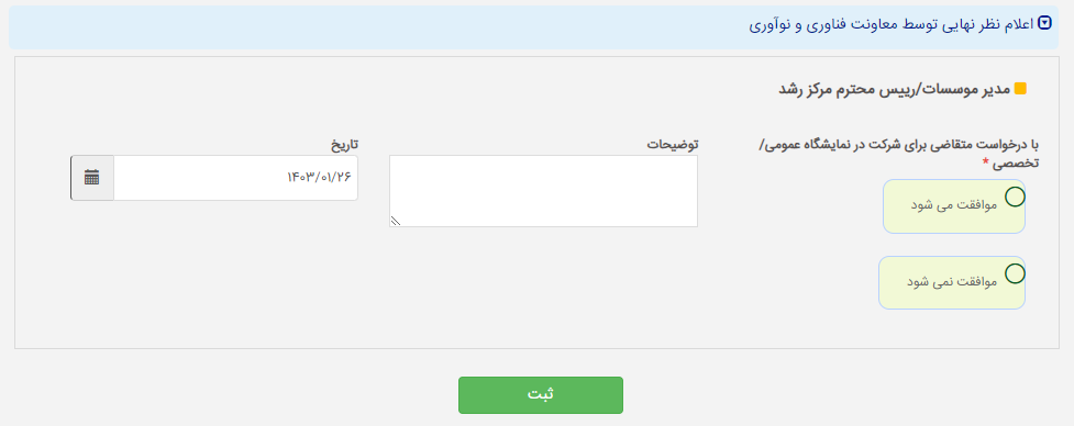 فرم مشخص شده را بر اساس اطلاعات مربوطه تکمیل کرده و سپس دکمه ثبت را برای ارجاع فرم به واحد معاونت فناوری و نوآوری انتخاب نمایید.