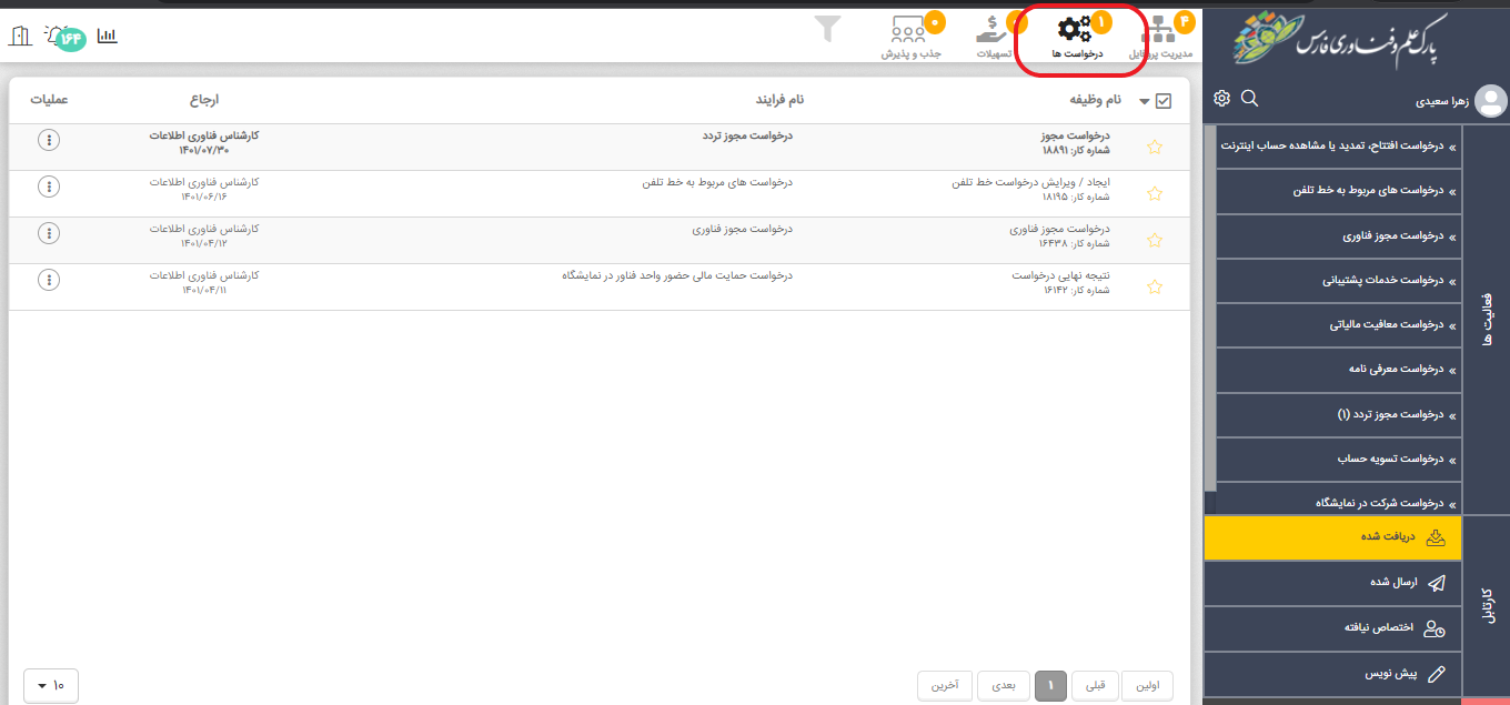 پس از ورود به صفحه اصلی، از منو بالا گزینه "درخواست ها" را انتخاب نمایید.
