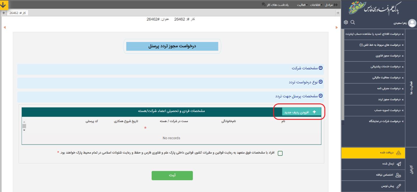 در فرم باز شده به تعداد پرسنلی که نیاز به اخذ مجوز دارند، دکمه "افزودن ردیف جدید" را فشار دهید و مشخصات فرد مورد نظر را در فرم مربوطه وارد کنید.
