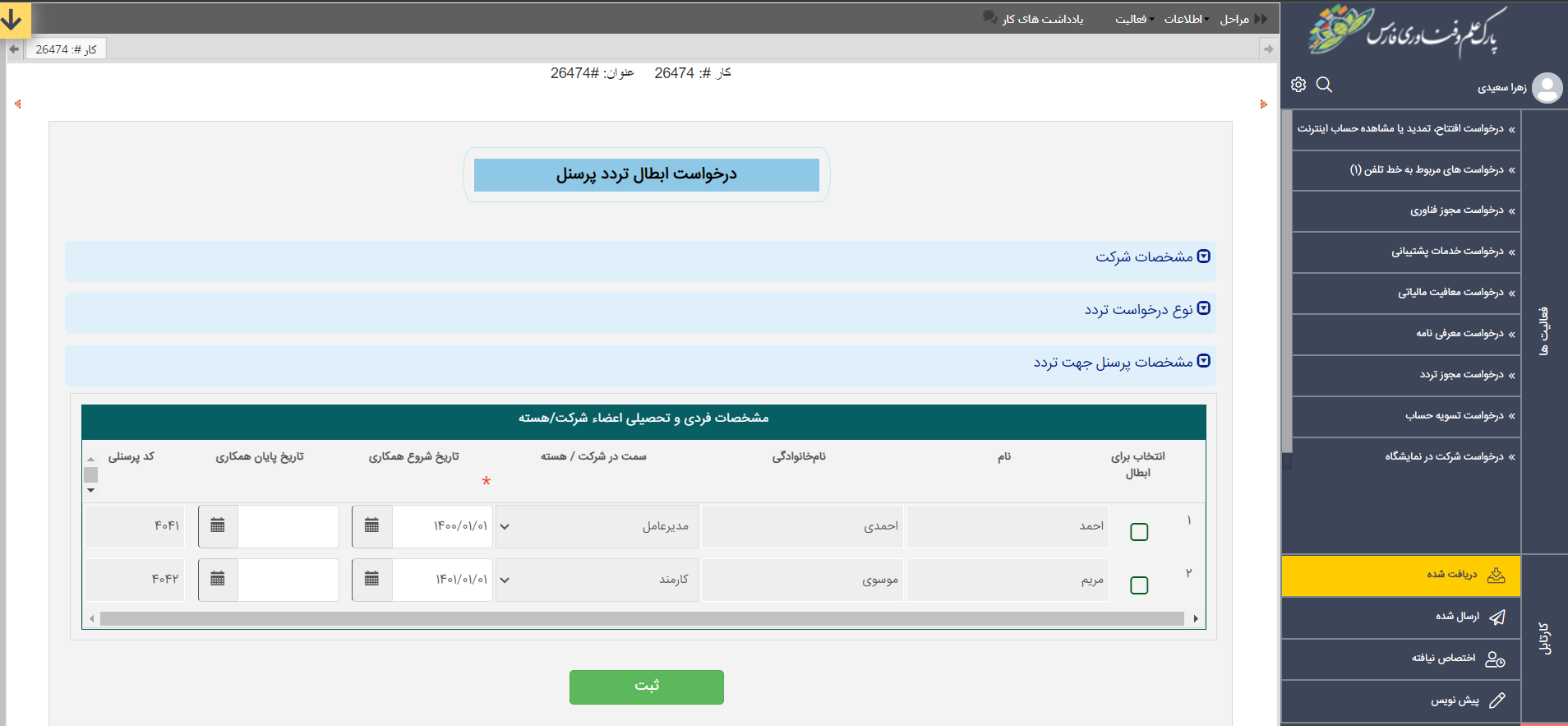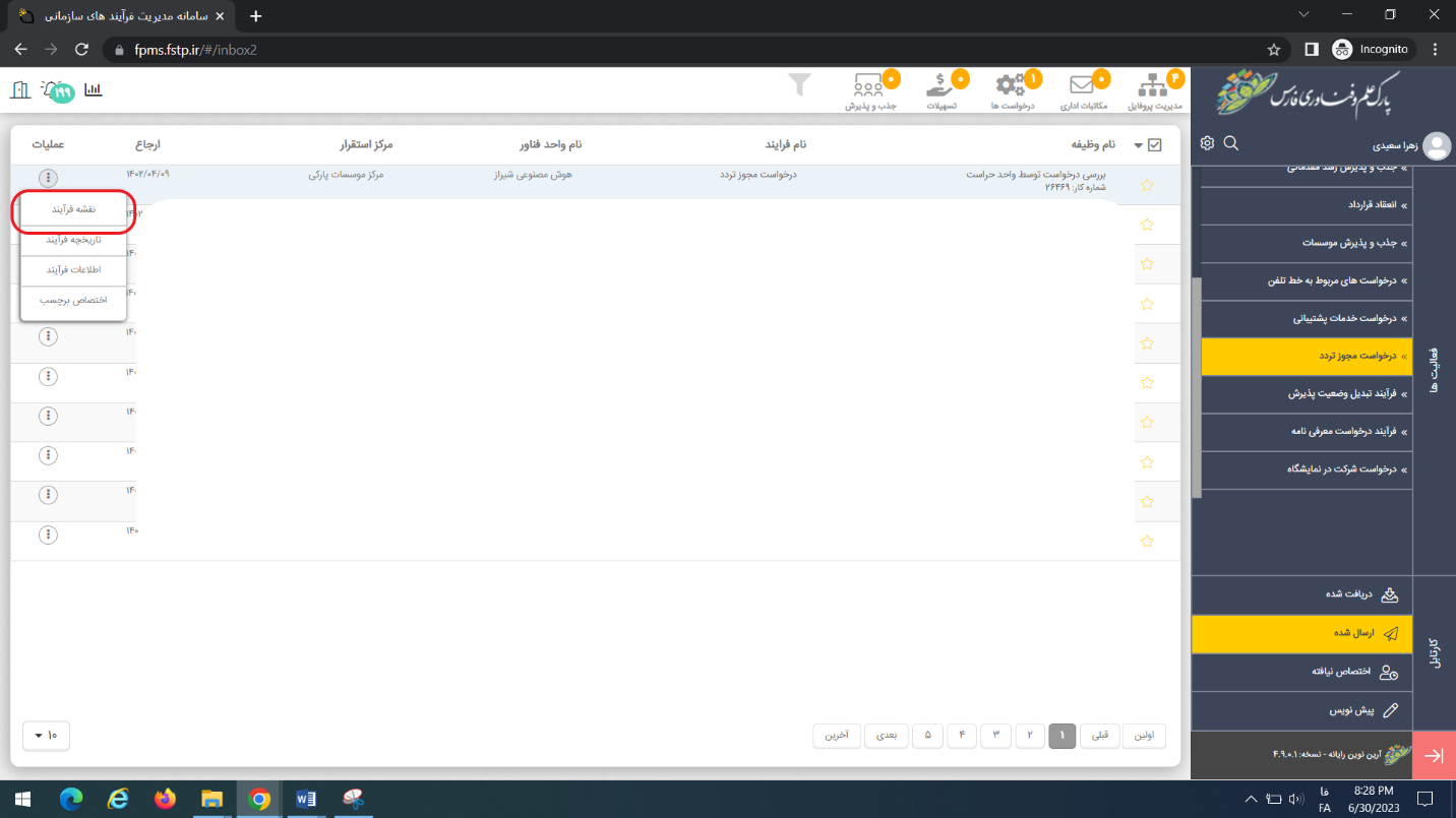راهنمای درخواست ثبت و مجوز تردد پرسنل از طریق سامانه فرایندها