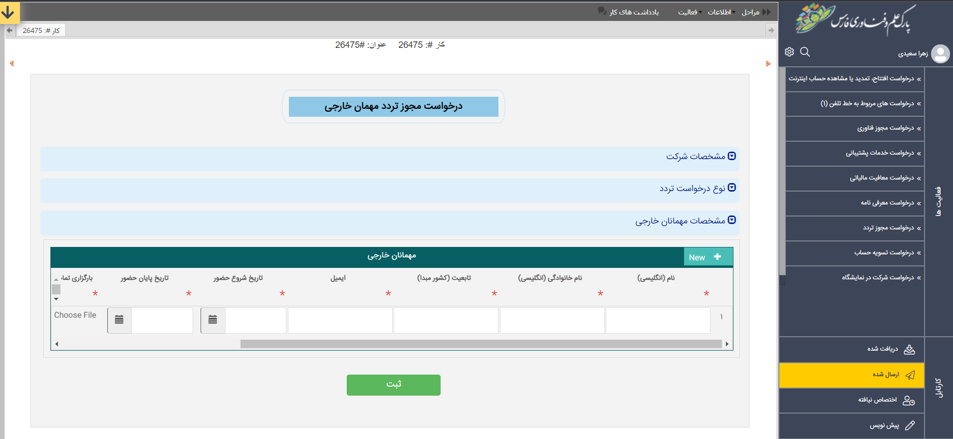 برای مجوز تردد اتباع(مهمان) خارجی باید از قسمت "نوع درخواست" گزینه "مجوز تردد اتباع خارجی" را انتخاب نمایید و سپس دکمه ثبت را فشار دهید.