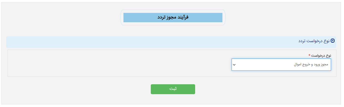 برای گرفتن مجوز ورود و خروج اموال باید از قسمت "نوع درخواست" گزینه "مجوز ورود و خروج اموال" را انتخاب نمایید و سپس دکمه ثبت را فشار دهید.